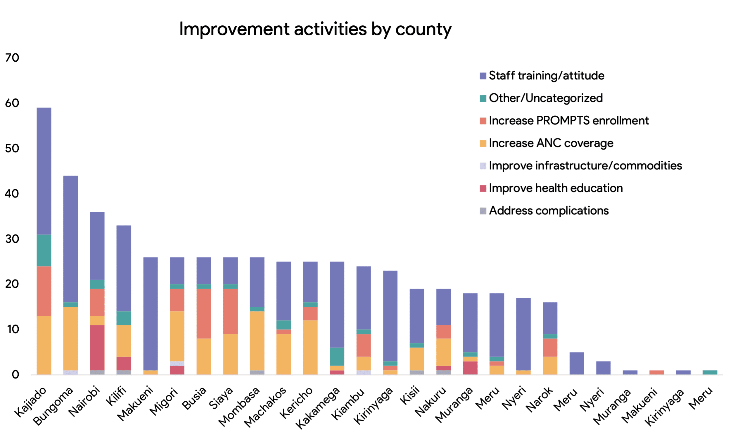 Some counties identify more diverse gaps because they measure differently or more in depth. In most counties, the gaps flagged in PULSE focus narrowly on ANC, because that’s what counties are set up to measure. In some counties, managers look at more detailed data on maternal and newborn outcomes, which leads them to surface issues like postpartum hemorrhage, obstructed labor, and prematurity, alongside ANC coverage. As a result, their proposed solutions also reflect this wider lens, focusing more on skills-based responses such as continuing medical education on newborn resuscitation and post-partum hemorrhage, staff upskilling, and mentorship, rather than relying mainly on quick wins like health talks.