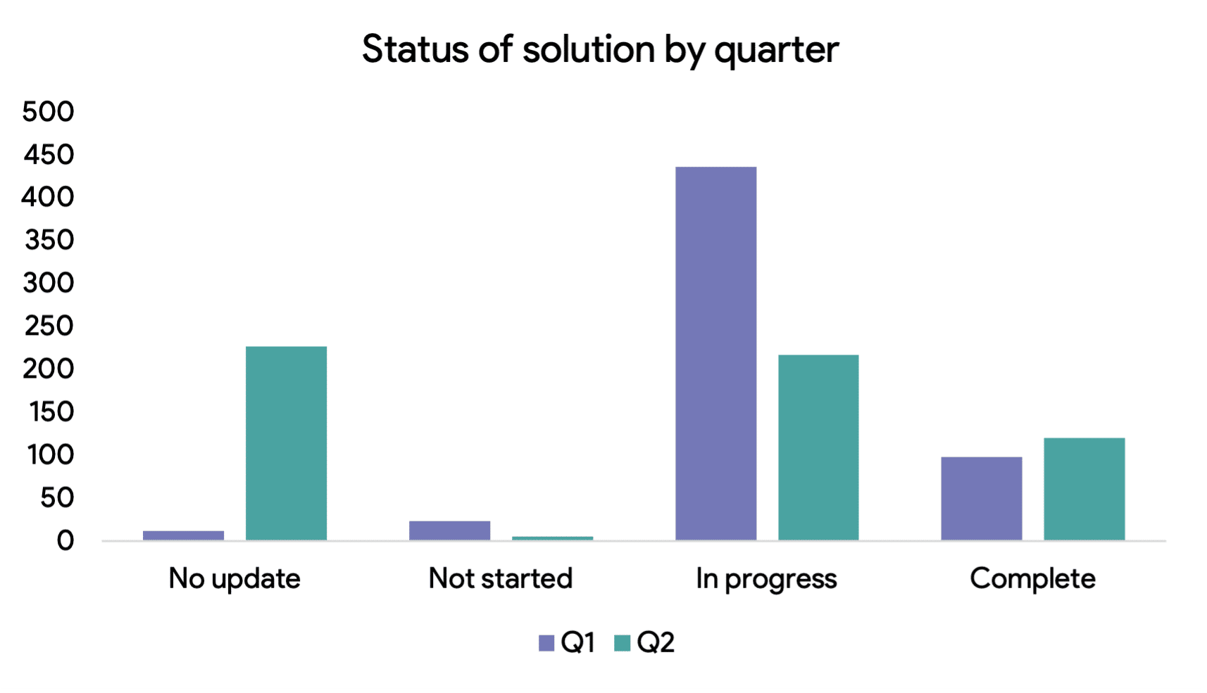 The improvement activities are being acted upon. Counties aren’t just identifying gaps and potential solutions, they are following through. Between Q1 and Q2, the number of activities marked “in progress” fell from 436 to 217, while “complete” rose from 98 to 120.