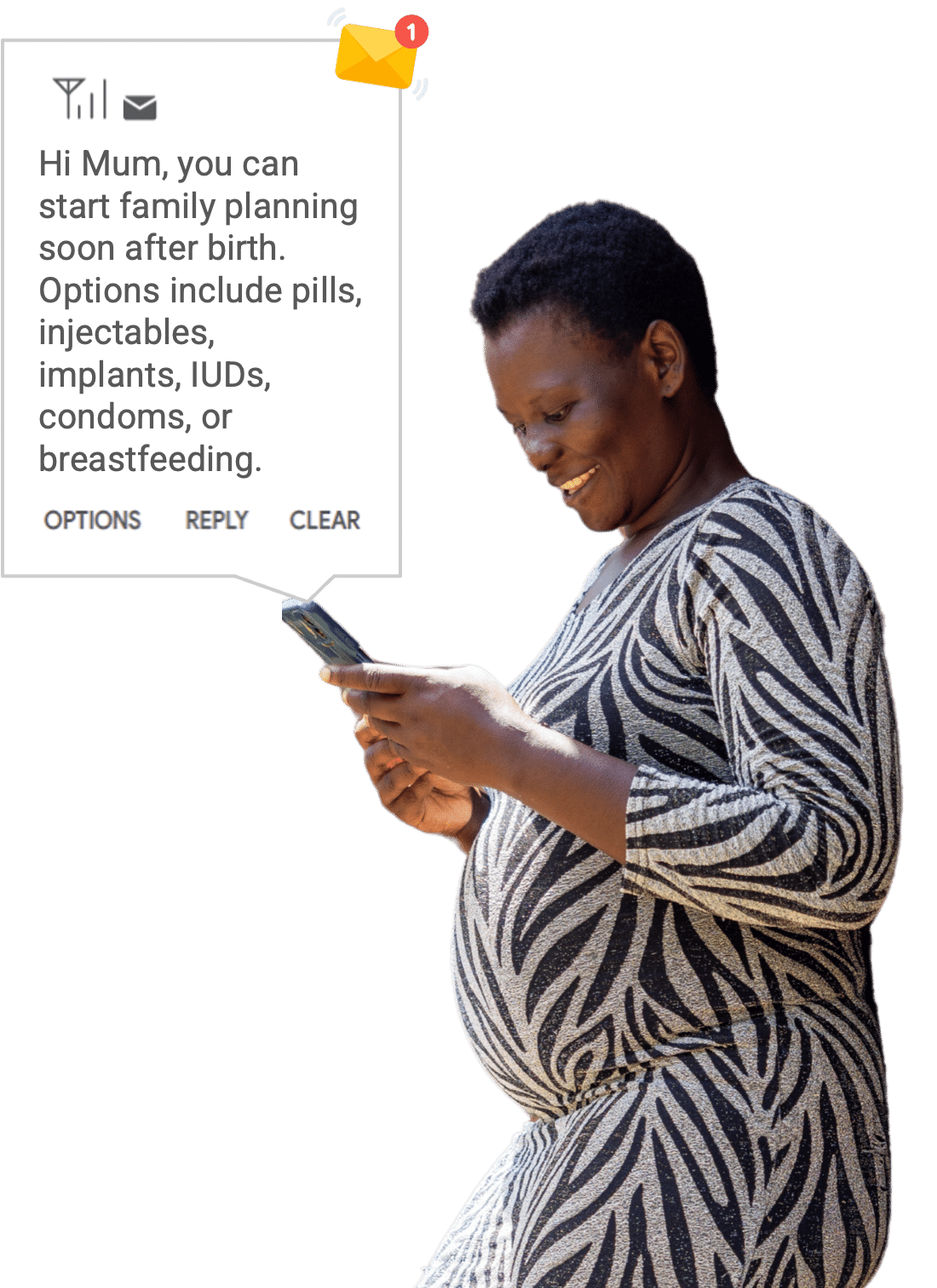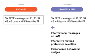 Currently, all mothers on PROMPTS receive six messages on PPFP during the postpartum period. These messages cover the benefits of spacing births, modern contraceptive methods, and a reminder that fertility can return soon after childbirth. We have experimented with sending additional messages and introducing AI-enabled FP counselling into PROMPTS.