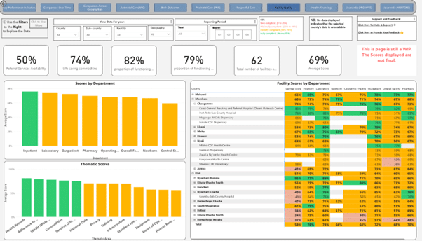 - Strengthen facility management: In Makueni County, FQA showed that inpatient departments were performing well, but the newborn unit (NBU) had critical gaps across HRH, WASH, infrastructure, equipment, and SOPs. These insights helped the county identify where to focus quality improvement efforts, including strengthening NBU readiness and prioritizing human resources for health deployment.